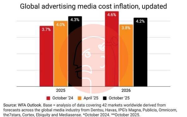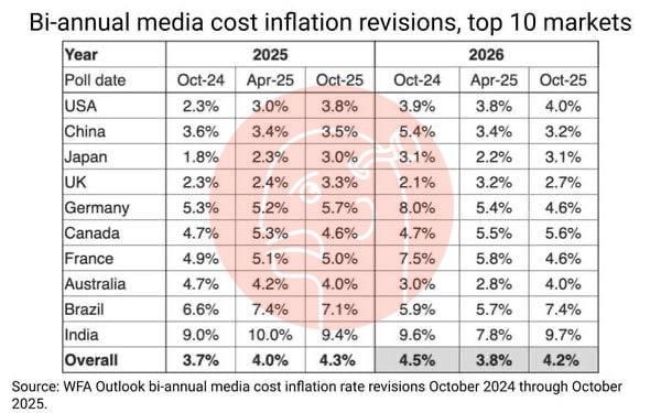 🤔Согласно данным Всемирной федерации рекламодателей (WFA), в 2025 году мировая инфляция затрат на рекламу ускорится до 4,3%, что на 0,6% выше прошлогоднего прогноза.