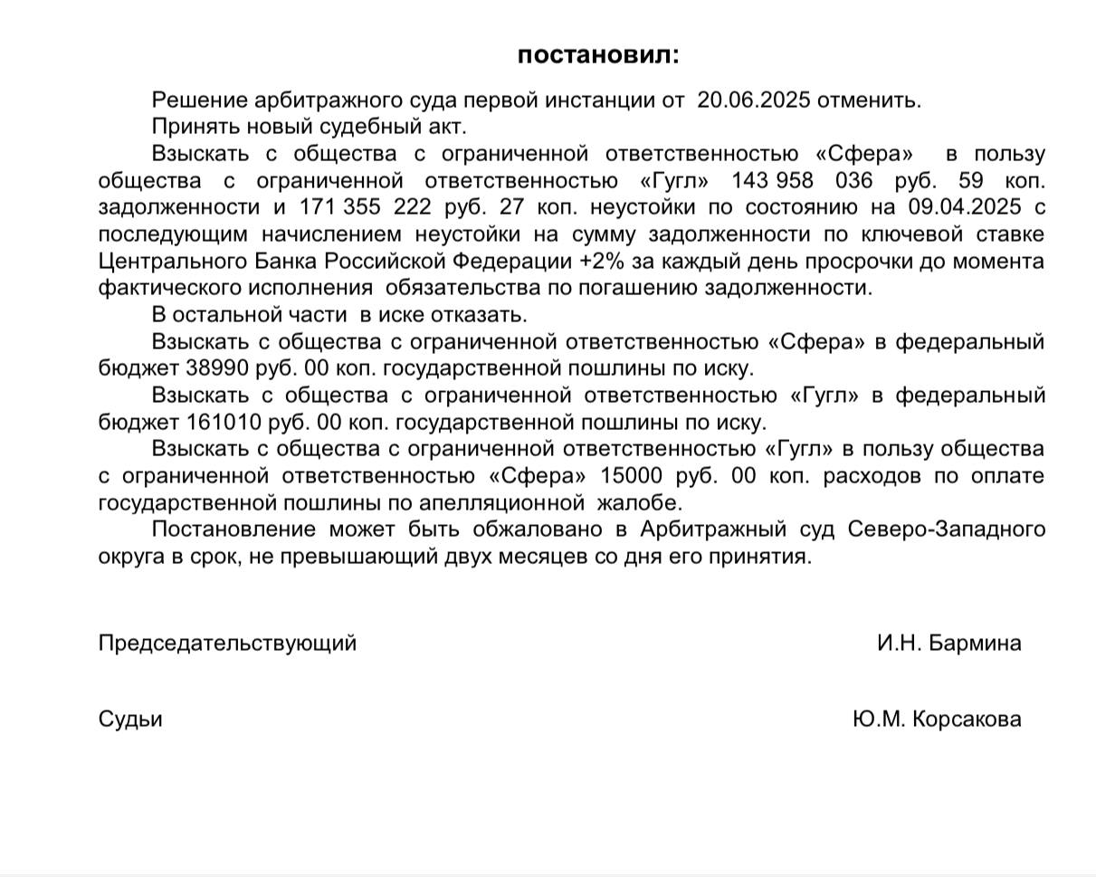 Апелляция отменила предыдущее решение почти полностью. «Гугл» не смог доказать больше миллиарда долга — не было актов и первичных документов, только внутренняя бухгалтерия. Суд признал обоснованным лишь долг на 143,9 млн руб. по конкретным аккаунтам и взыскал эту сумму + 171 млн руб. неустойки.