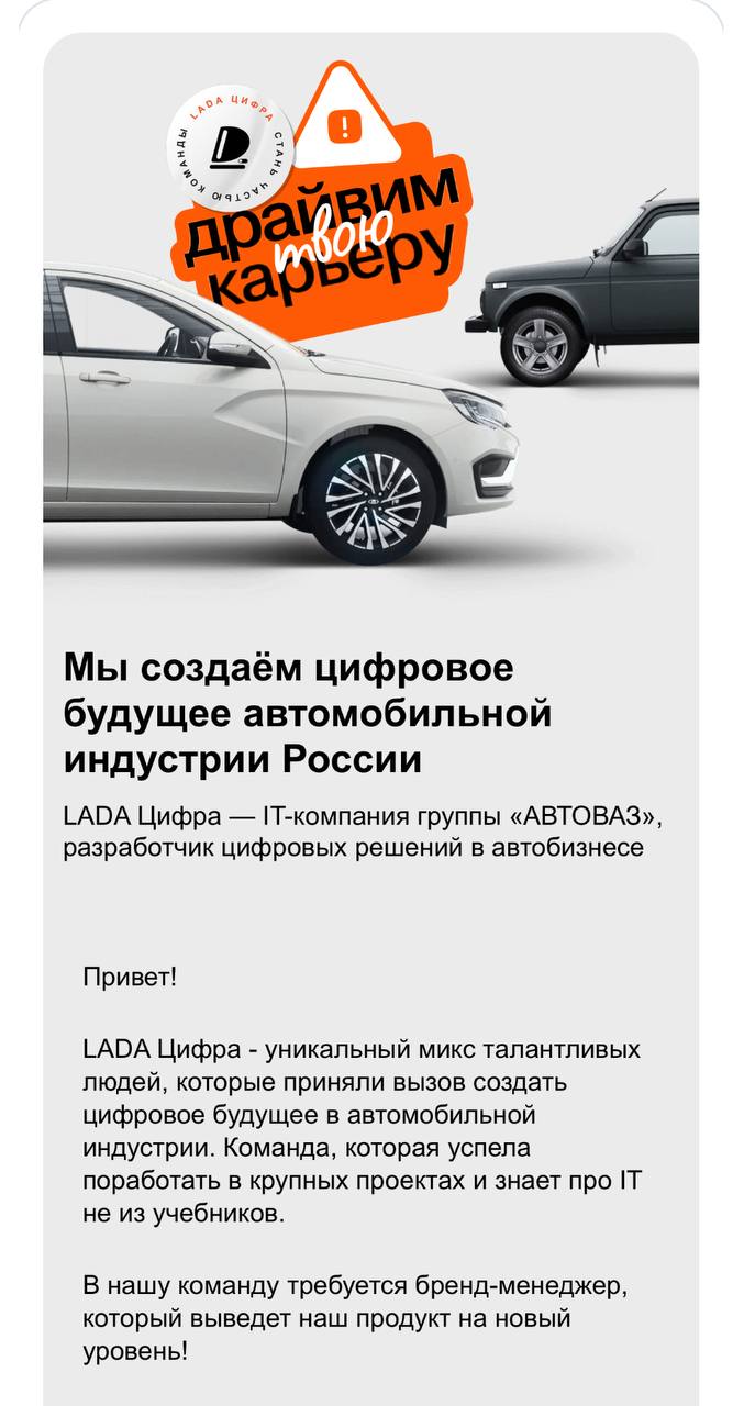 🤔Оказывается у АвтоВАЗа есть визионерское подразделение «Лада Цифра» в которое ищут амбициозных маркетологов.