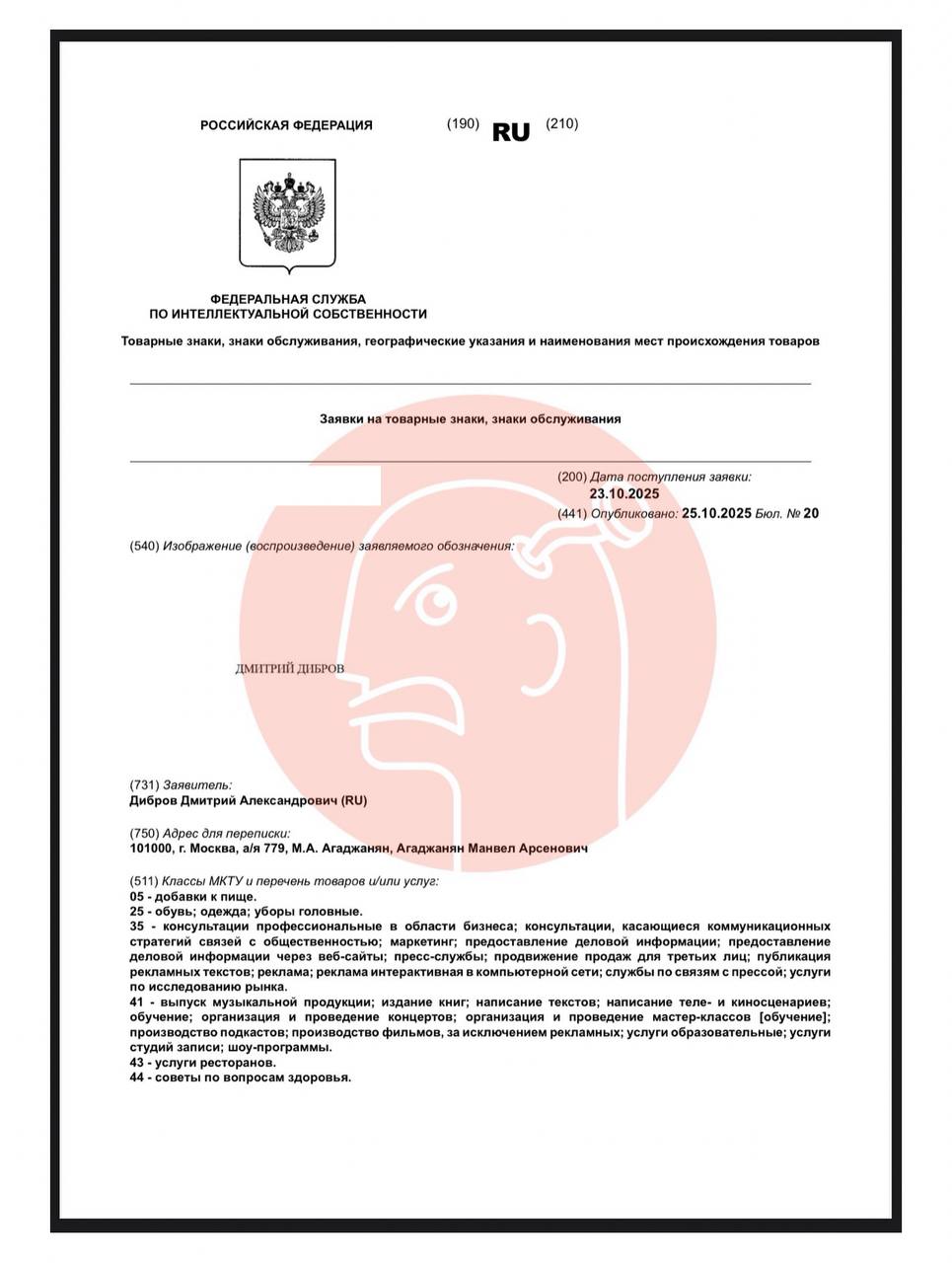 🤔И Дмитрий Дибров заявил свои права на товарный знак со своим именем. В максимально странных категориях: «советы по вопросам здоровья», «добавки к пище», «головные уборы»…