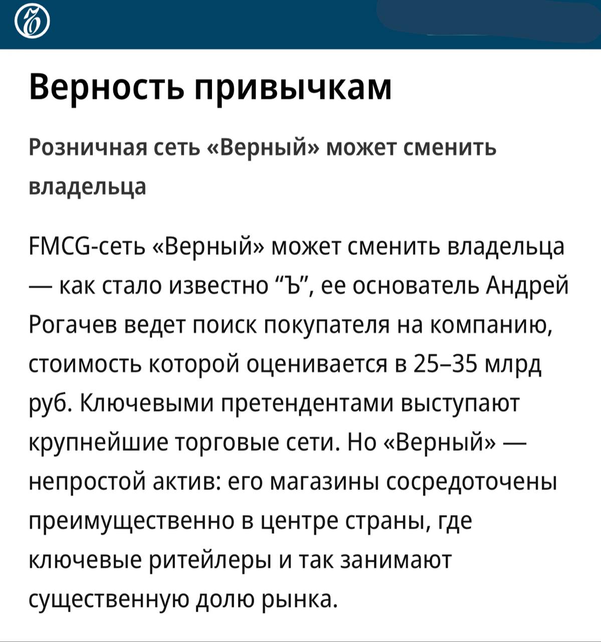 В Коммерсанте оферта на продажу Верного. Доброе утро.