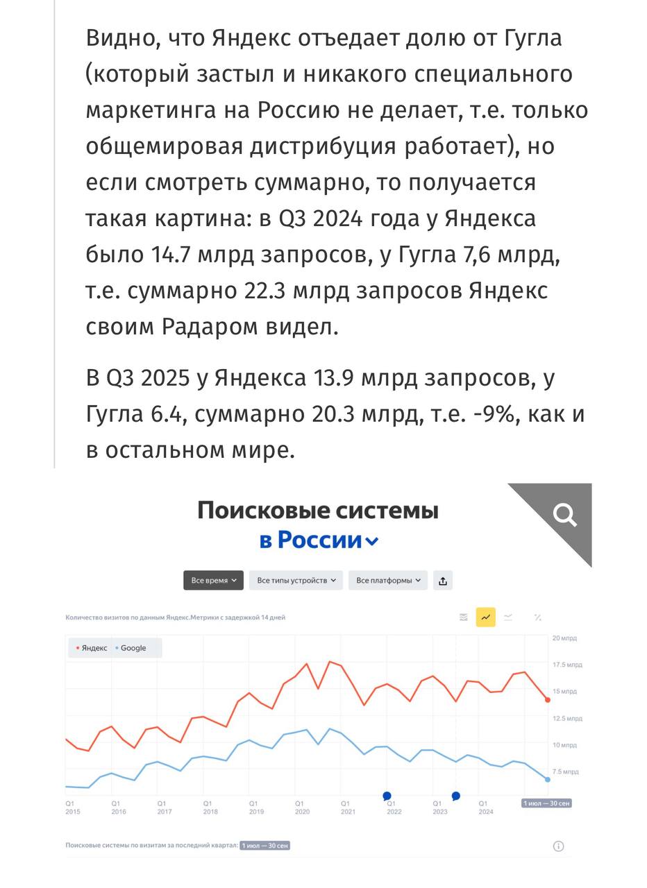 🤓Совершенно справедливые рассуждения о падении трафика поисковиков от roem. Не удивимся, если через 5 лет Яндекс станет чем-то вроде успешного Рамблера: куча разнородных активов и никто не помнит что такое поиск.