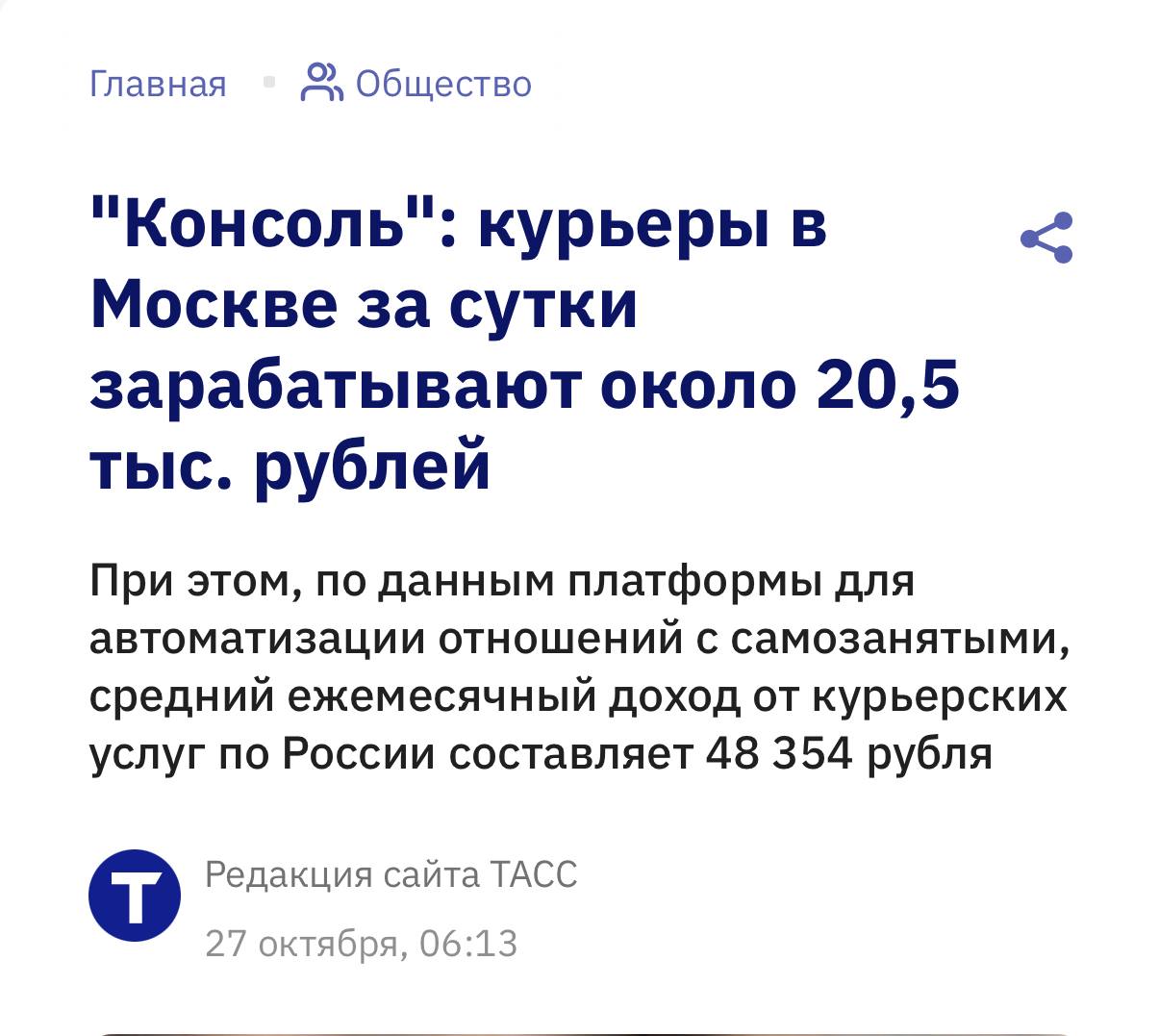 🤓ТАСС разжигает социальное неравенство, сообщая что курьеры в Москве ежедневно зарабатывают фантастическую для жителей России сумму — более 20 тысяч рублей. Это 600 тыс. в месяц при ежедневной занятости.