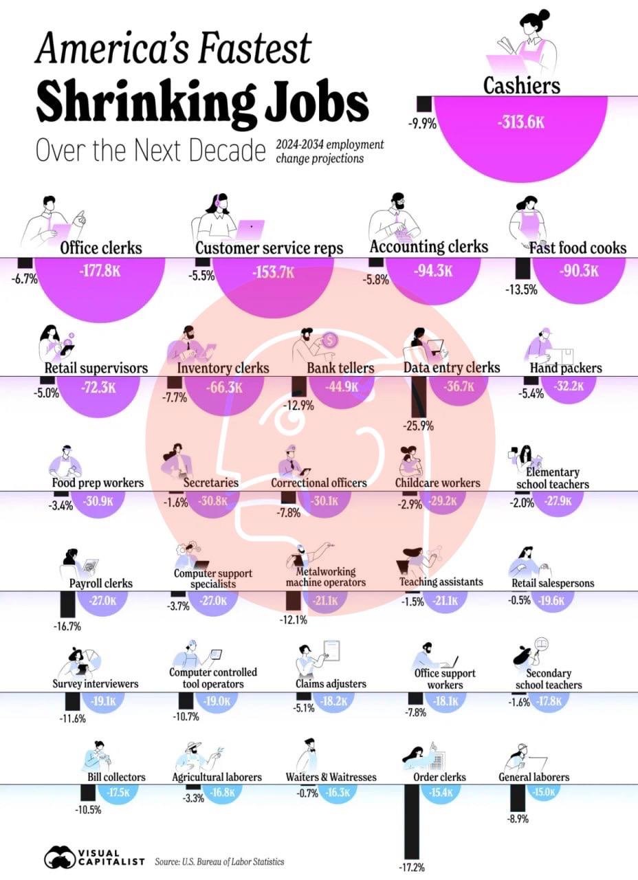 🤔В США за следующее десятилетие исчезнет более 313 тысяч рабочих мест кассиров.