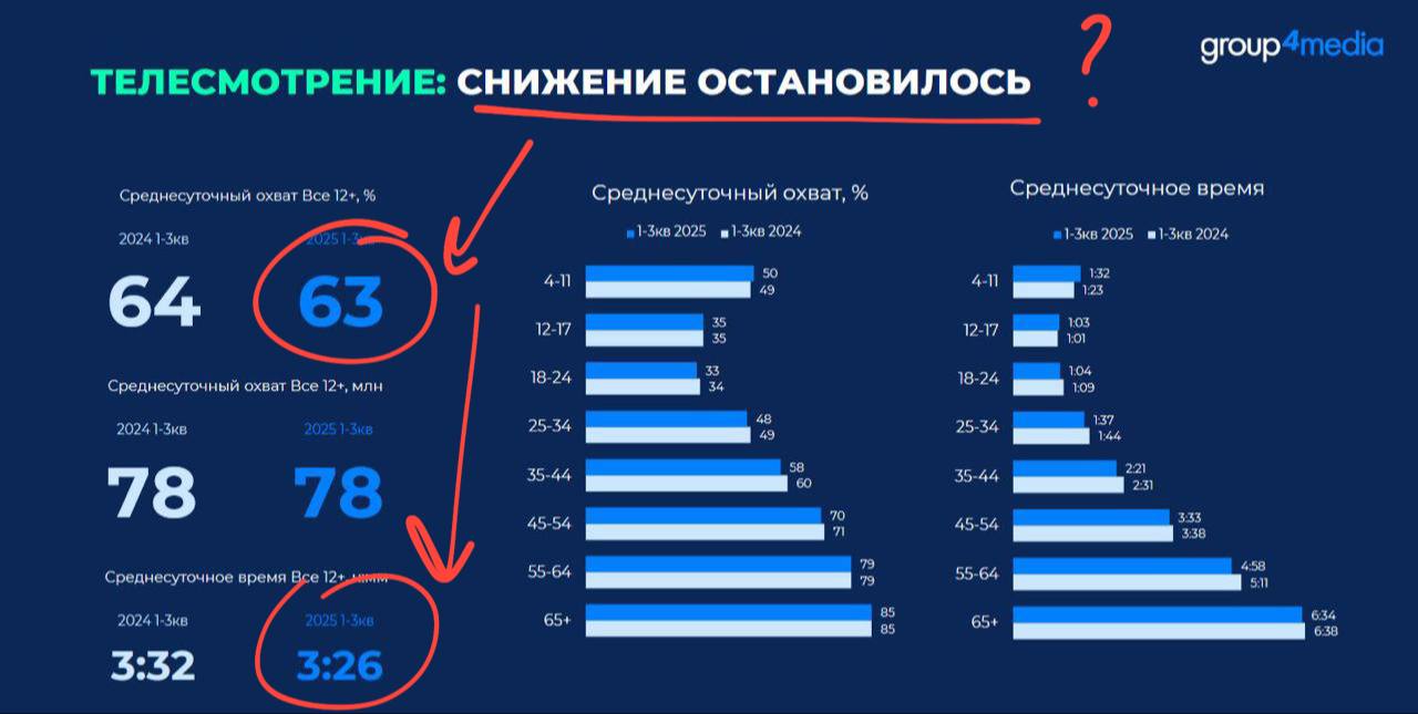 — Снижение телесмотрения остановилось? А как же цифры? Почти все показатели этого года ниже, чем в предыдущем. Или «слабо падает» — это уже «остановилось»?