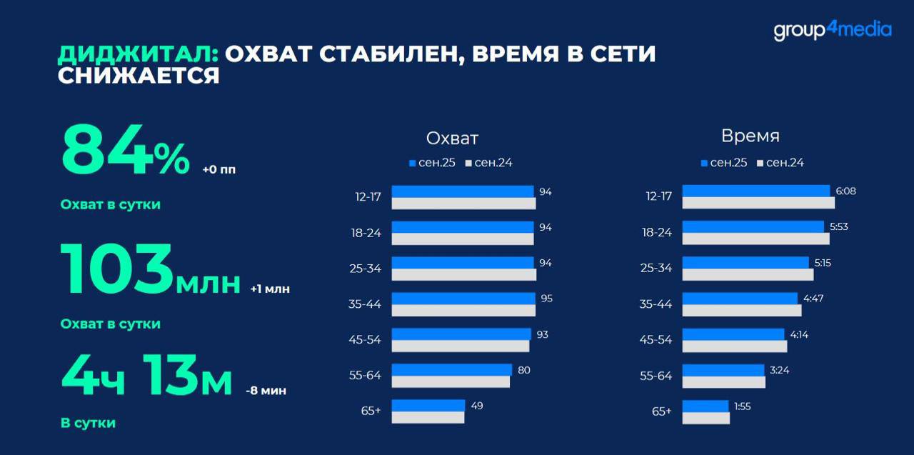 — И об офлайне. Он значимо сокращается по той же причине. Тут коллеги совершенно правы: время, проведённое в сети, падает у всех групп населения, а число пользователей не растёт.