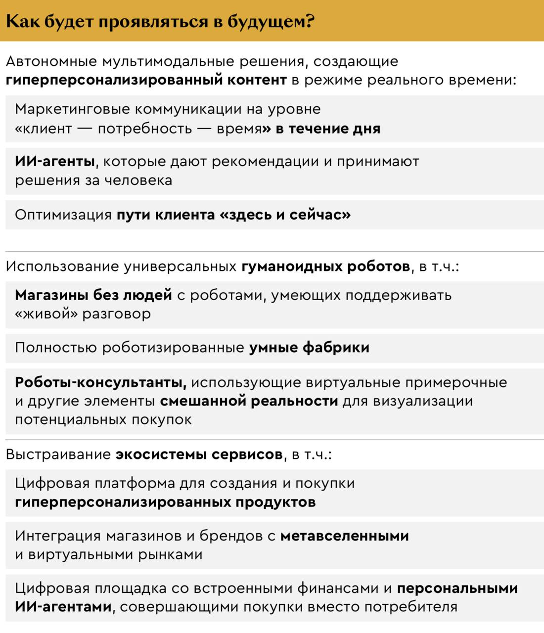 На самом деле все будет по-другому. Но никто не знает как — поскольку настоящих футуристов и визионеров в компаниях не держат, и вся фантазия работников опирается на уже виденное в кино и читанное в презентациях консалтинговых агентств. В их глазах будущее выглядит несбыточно банально…