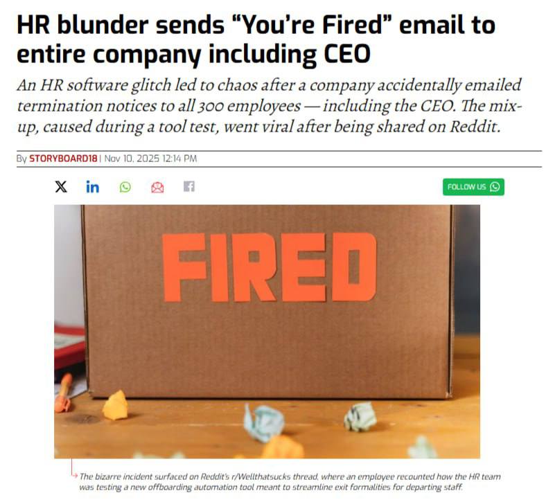 В одной индийской компании произошел настоящий апокалипсис. Из-за сбоя в HR-системе всем 300 сотрудникам, включая директора, случайно пришло письмо с темой «Вы уволены». HR-отдел просто тестировал новое ПО для увольнений, но забыл выключить «боевой режим» и система запустила рассылку по всей компании.