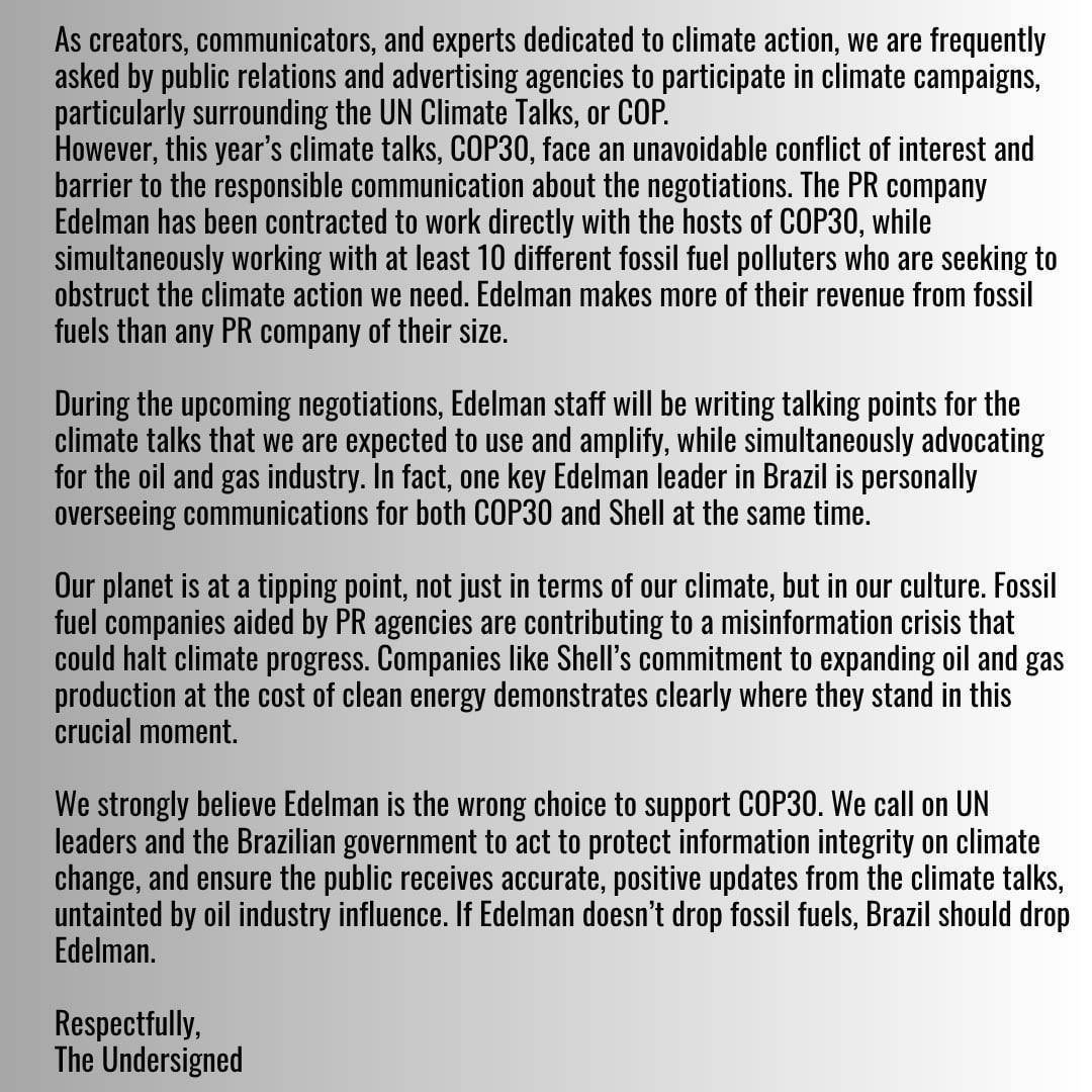ΠΠ½ΠΈ Π½Π°Π·ΡΠ²Π°ΡΡ, ΡΡΠΎ ΡΠΈΡΡΠ°ΡΠΈΡ Π»ΠΈΡΠ΅ΠΌΠ΅ΡΠ½Π°, ΠΏΠΎΡΠΊΠΎΠ»ΡΠΊΡ ΠΎΠ΄ΠΈΠ½ ΠΈΠ· ΡΡΠΊΠΎΠ²ΠΎΠ΄ΠΈΡΠ΅Π»Π΅ΠΉ Edelman Π²Π΅Π΄Π΅Ρ ΠΊΠΎΠΌΠΌΡΠ½ΠΈΠΊΠ°ΡΠΈΠΈ Π΄Π»Ρ COP30 ΠΈ Shell ΠΎΠ΄Π½ΠΎΠ²ΡΠ΅ΠΌΠ΅Π½Π½ΠΎ.