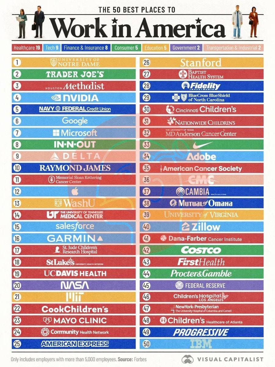 Π£Π½ΠΈΠ²Π΅ΡΡΠΈΡΠ΅Ρ ΠΠΎΡΡ-ΠΠ°ΠΌ, ΡΠ΅ΡΡ ΠΏΡΠΎΠ΄ΡΠΊΡΠΎΠ²ΡΡ ΠΌΠ°Π³Π°Π·ΠΈΠ½ΠΎΠ² Trader Joe's ΠΈ ΠΌΠ΅Π΄ΠΈΡΠΈΠ½ΡΠΊΠ°Ρ ΡΠΈΡΡΠ΅ΠΌΠ° Houston Methodist Π²ΠΎΠ·Π³Π»Π°Π²ΠΈΠ»ΠΈ ΡΠ΅ΠΉΡΠΈΠ½Π³ 50 Π»ΡΡΡΠΈΡ ΡΠ°Π±ΠΎΡΠΎΠ΄Π°ΡΠ΅Π»Π΅ΠΉ Π‘Π¨Π 2025 Π³ΠΎΠ΄Π°, ΠΏΡΠΈ ΡΡΠΎΠΌ Π·Π΄ΡΠ°Π²ΠΎΠΎΡ ΡΠ°Π½Π΅Π½ΠΈΠ΅ Π΄ΠΎΠΌΠΈΠ½ΠΈΡΡΠ΅Ρ Ρ 19 ΠΊΠΎΠΌΠΏΠ°Π½ΠΈΡΠΌΠΈ Π² ΡΠΏΠΈΡΠΊΠ΅, Π·Π° Π½ΠΈΠΌ ΡΠ»Π΅Π΄ΡΡΡ ΡΠ΅Ρ Π½ΠΎΠ»ΠΎΠ³ΠΈΠΈ (9) ΠΈ ΡΠΈΠ½Π°Π½ΡΡ (8).