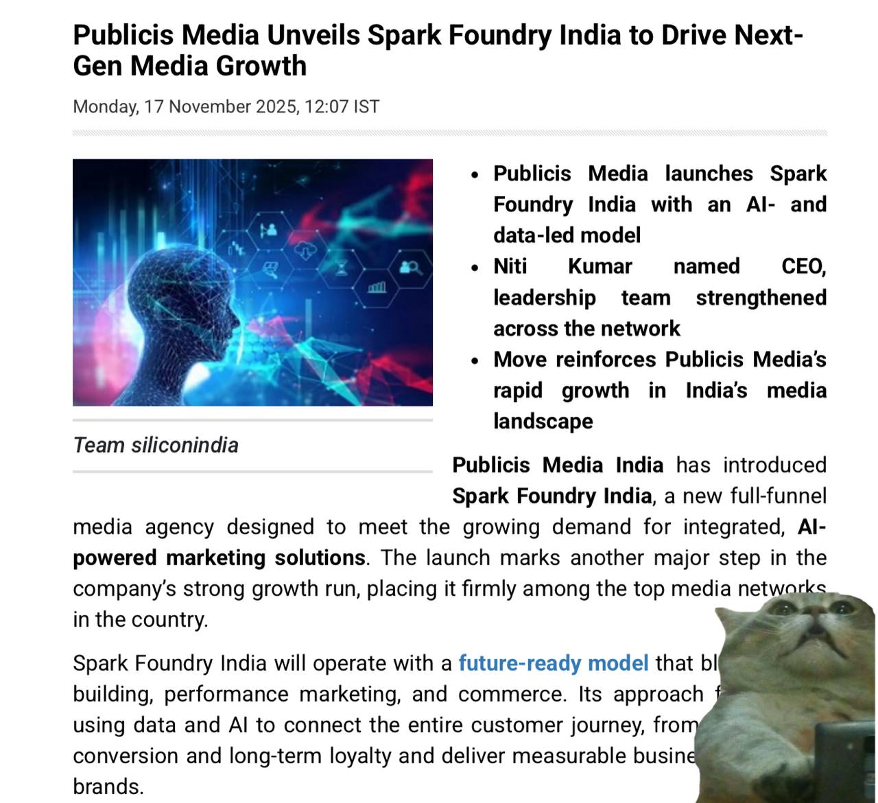 Publicis Media запускает в Индии агентство Spark Foundry India, ориентированное на интегрированные маркетинговые решения с использованием данных и искусственного интеллекта.