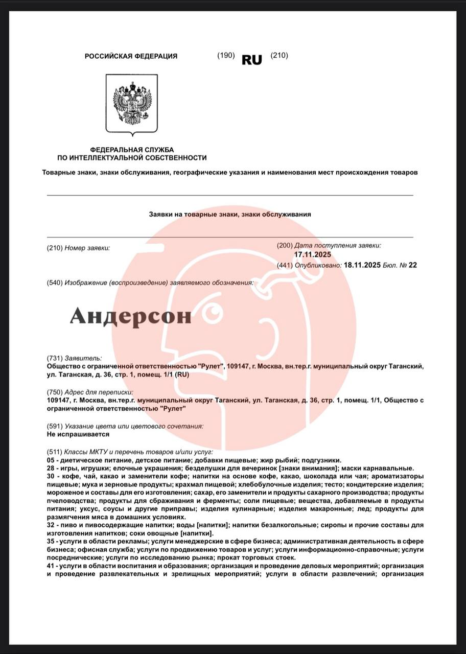 🤓Сеть кафе «Андерсон» затеяла ребрендинг. Напомним, теперь она принадлежит Вкусвиллу. Заявка на регистрацию нового логотипа подана от имени юрлица ритейлера.