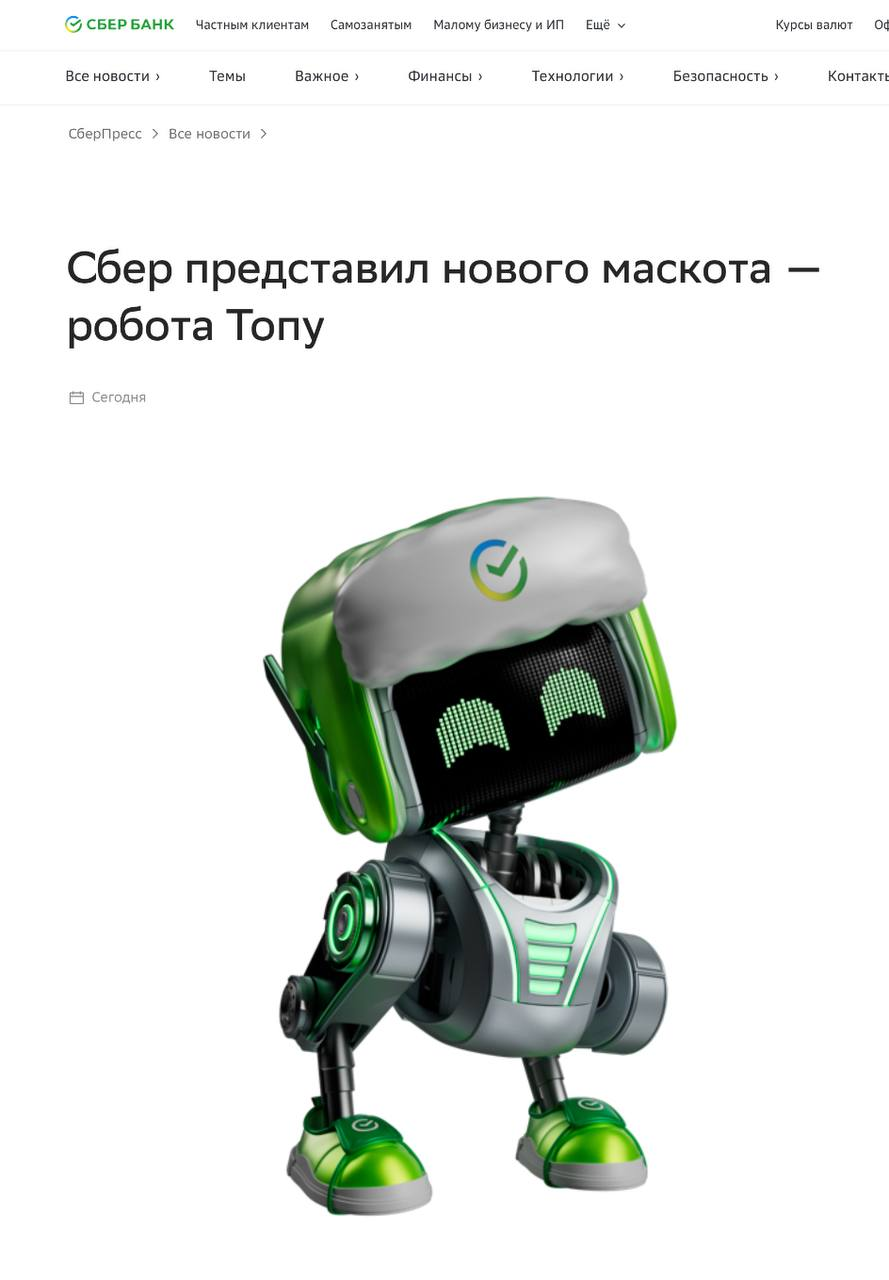 ⚡️Экстренные новости. Кажется, Сбер-коту готовят замену. Сегодня в срочном порядке пресс-служба кредитной организации представила преемника — робота Топу. Кажется, в крупнейшем экосистемном банке страны грядет ротация маскотов.