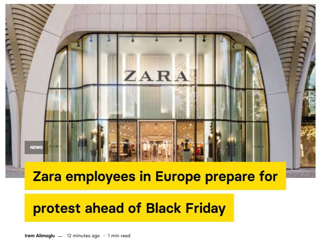 Сотрудники Zara в Европе готовяся к масштабным протестам в «чёрную пятницу», требуя от материнской компании Inditex вернуть программу распределения прибыли, которую отменили после пандемии.
