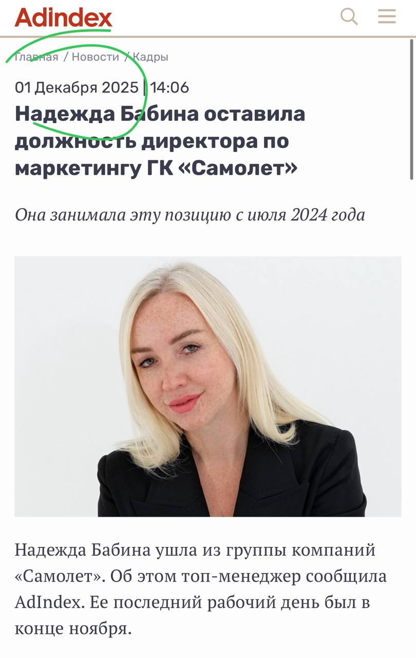 🤓То что руководитель маркетинга Самолета покидает компанию было ясно из этой новости двухнедельной давности. Кажется, сегодняшнее уточнение того же Адиндекса — скорее, про публичную открытость Надежды к новым предложениям на рынке труда. Поддержим и в нашем издании.