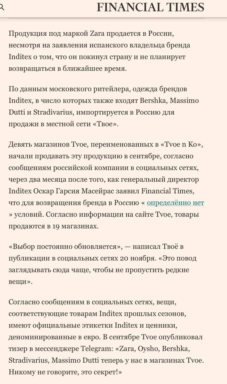🤓Замечательно. Российский ритейлер «Твое» снова на страницах Financial Times и заставляет оправдываться генерального директора Inditex Оскара Гарсия Масейрас. Так им!