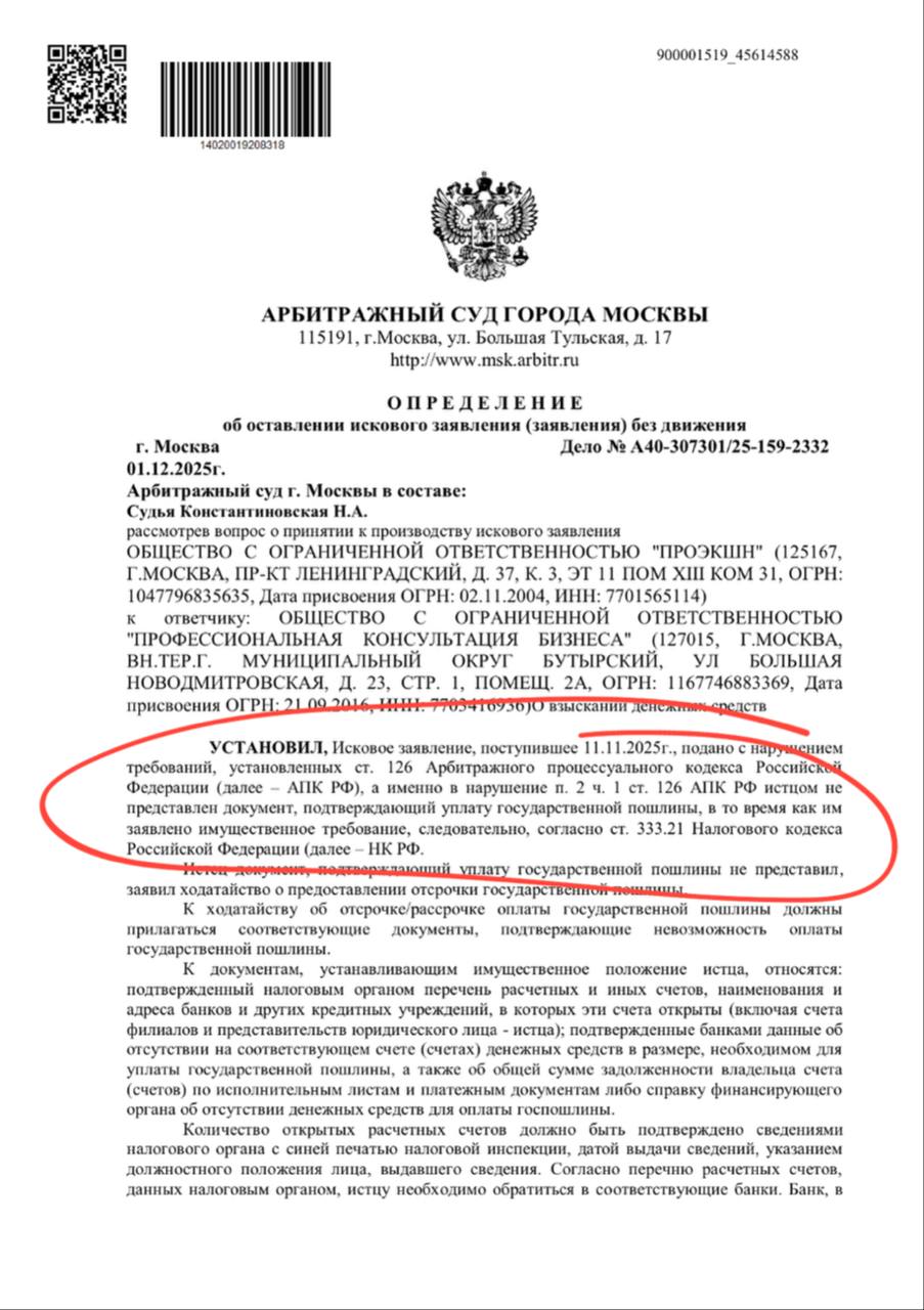 🤓Любопытный иск агентства Экшн к финансовым консультантам по возмещению двух миллардов неуплаченных в казну налогов оставлен без движения. Потому что (держитесь за стулья) юристы истца забыли заплатить пошлину.