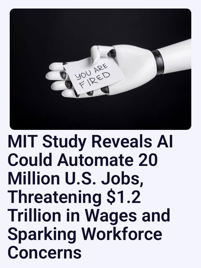 🤔В США исследование MIT показало, что искусственный интеллект может автоматизировать до 20 млн рабочих мест, это около 12% трудовой силы страны и $1,2 трлн годовых зарплат под угрозой.