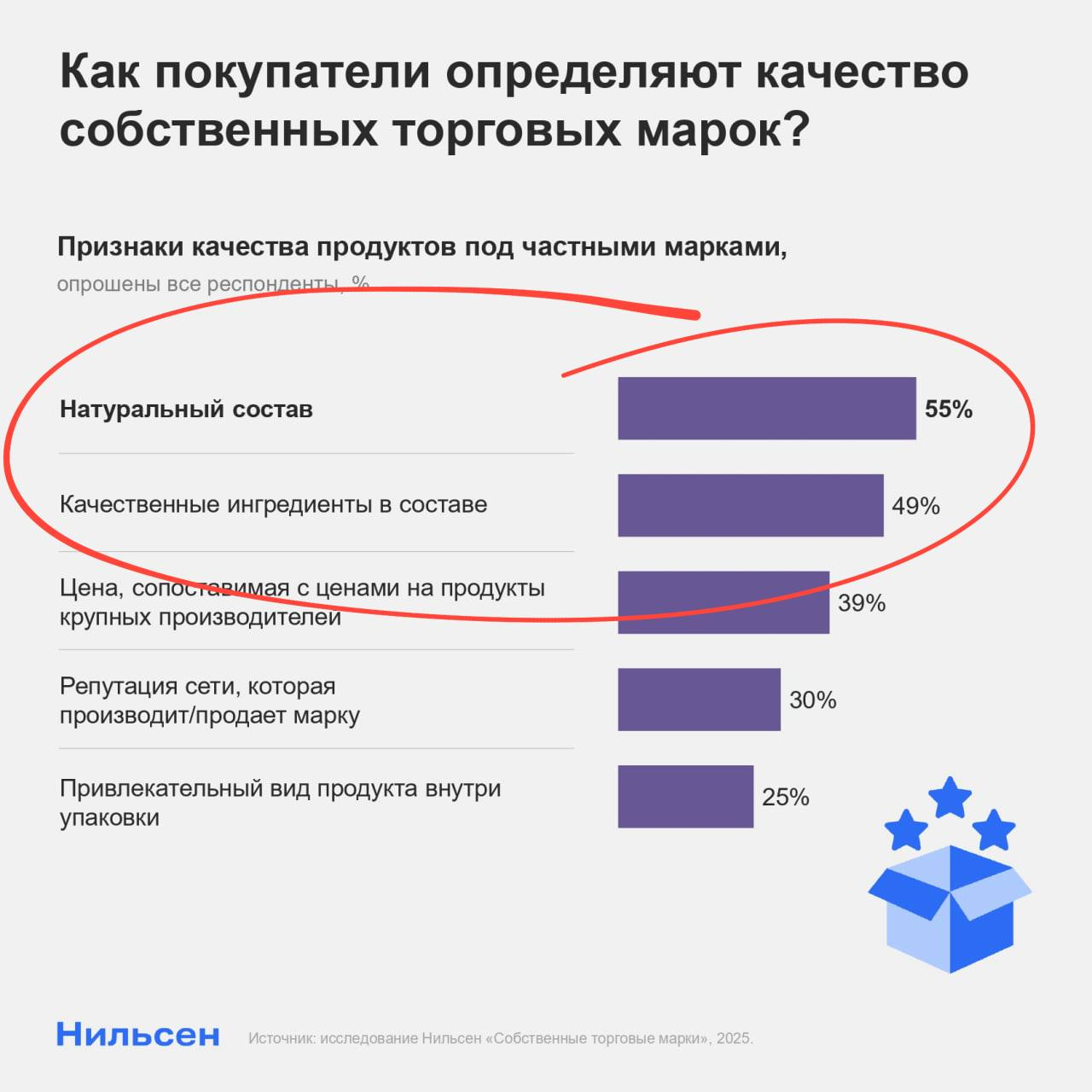 🤓Скромно обращаем внимание, что два первых (и самых важных аспекта по мнению респондентов Nielsen) в оценке СТМов — потребитель просто не может контролировать. Натуральный состав и качественные ингредиенты — абсолютно неосязаемая для обывателя штука. Он верит листочку на упаковке и амбиции в слогане.