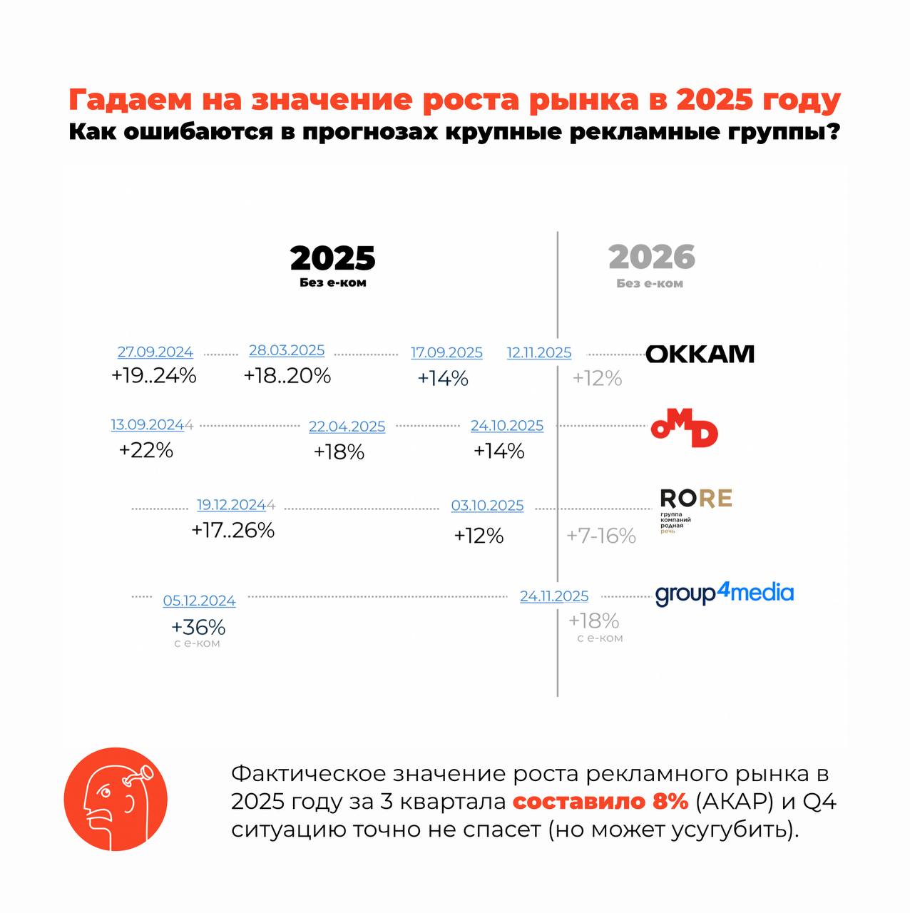Каждый год агентства и группы тыкают пальцем в небо, пытаясь угадать каким будет рост рынка в грядущем году. Предполагается, что они близки к клиентским бюджетам, а потому обладают каким-то сакральным знанием.