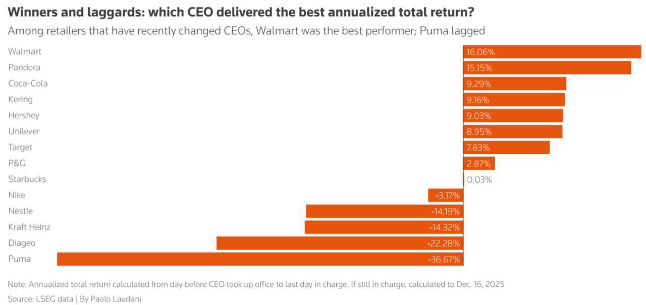 🤔Глобальные компании потребительского сектора всё чаще меняют генеральных директоров. Им кажется, что так оно могут ускорить рост на фоне замедления продаж, нестабильности из-за тарифов США и трудностей с привлечением молодых покупателей.