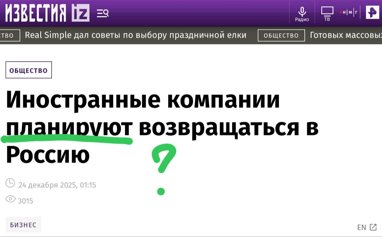 Журналисты Известий, при этом, слышат только часть высказывания и пишут заголовок «Иностранные компании планируют возвращаться в Россию».