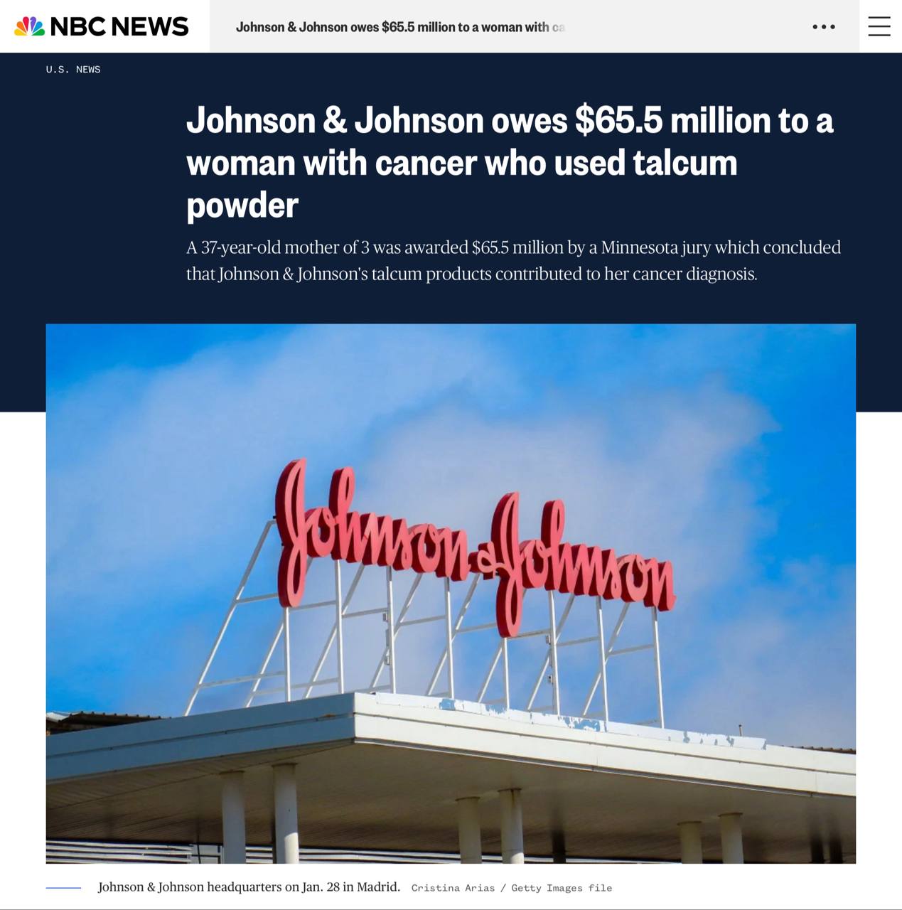 🤓Жюри в Миннесоте обязало Johnson & Johnson выплатить $65,5 млн женщине (37 лет), у которой развился рак (мезотелиома). Суд пришёл к выводу, что её длительное использование тальковой присыпки компании способствовало заболеванию, потому что продукт был загрязнён асбестом, и фирма недостаточно предупреждала об этом.