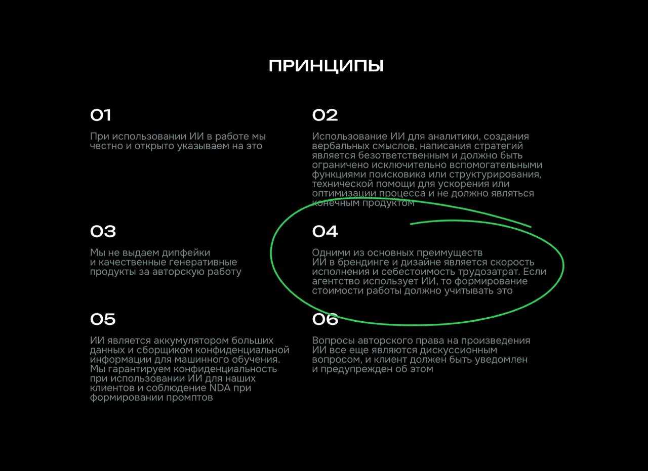 Не готовы подписаться только под четвертым пунктом «Если агентство использует ИИ, то формирование стоимости работы должно учитывать это». К чужим деньгам у нас особенно щепетильное отношение и обостренное чувство справедливости.