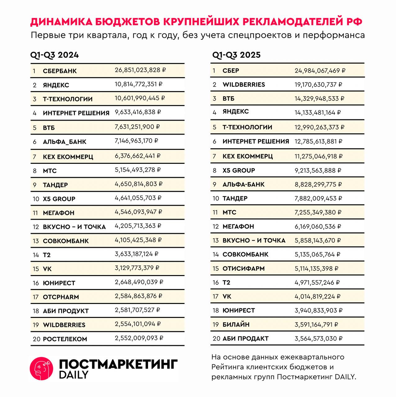 🤓Доброе утро! Пока все спят, мы начинаем баловаться аналитикой клиентских затрат 2025 года. Сравниваем ТОП-20 рекламодателей по затратам за 3 квартала, год к году. Рассчитано в единой методологии.