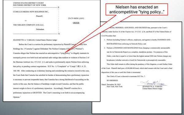 Π‘ΡΠ΄ ΠΏΠΎΠ΄Π΄Π΅ΡΠΆΠ°Π» ΡΠ°Π΄ΠΈΠΎΡ ΠΎΠ»Π΄ΠΈΠ½Π³ Cumulus Media, ΠΊΠΎΡΠΎΡΡΠΉ Π·Π°ΡΠ²ΠΈΠ», ΡΡΠΎ Nielsen Π·Π»ΠΎΡΠΏΠΎΡΡΠ΅Π±Π»ΡΠ΅Ρ Π΄ΠΎΠΌΠΈΠ½ΠΈΡΡΡΡΠΈΠΌ ΠΏΠΎΠ»ΠΎΠΆΠ΅Π½ΠΈΠ΅ΠΌ ΠΈ Π½Π°Π²ΡΠ·ΡΠ²Π°Π΅Ρ Π·Π°Π²ΡΡΠ΅Π½Π½ΡΠ΅ ΡΠ΅Π½Ρ Π½Π° Π½Π°ΡΠΈΠΎΠ½Π°Π»ΡΠ½ΡΠ΅ ΡΠ΅ΠΉΡΠΈΠ½Π³ΠΈ ΡΠ°Π΄ΠΈΠΎ.
