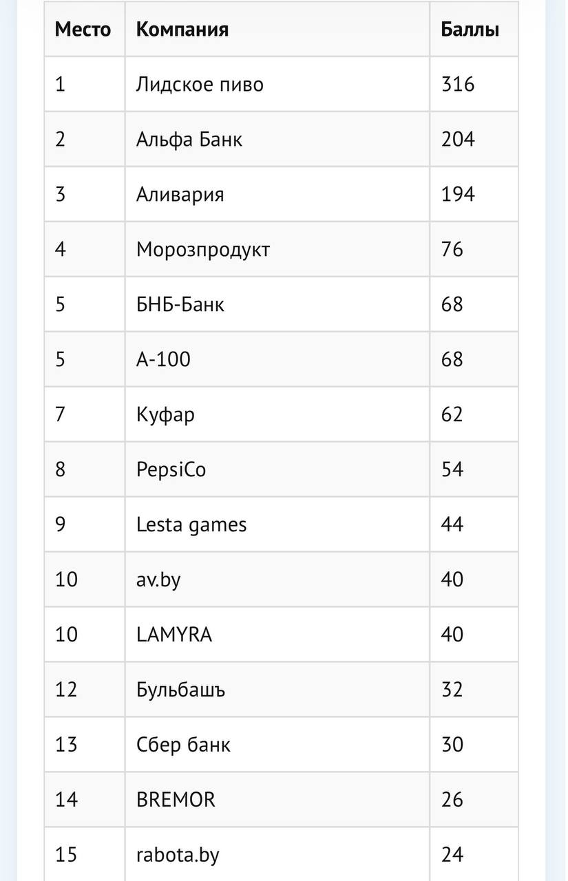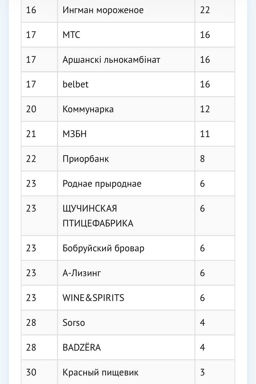 🤔Между тем, в Беларуси тоже есть свой рейтинг креативности. Братья-славяне не смешивают плоское с зеленым — потому в отдельном забеге сравнивают ту самую «креативность» брендов между собой.