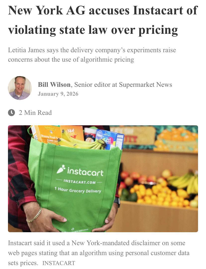 🤓В США генеральный прокурор штата Нью-Йорк Летиция Джеймс заподозрила сервис доставки Instacart в нарушении местного закона из-за использования алгоритмического ценообразования.