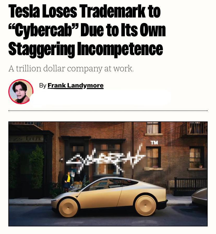 😂Tesla потеряла право на товарный знак Cybercab для своего беспилотного такси, потому что поздно подала заявку в Патентное ведомство США (USPTO), уже после публичной презентации проекта.