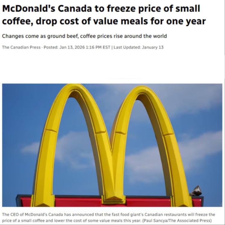 В Канаде McDonald’s на год замораживает цену маленького кофе на уровне $1 и снижает стоимость наборов McValue, это бюджетные комбо с бургером, картофелем фри и напитком, до $5, несмотря на рост цен на говядину и кофе по всему миру.