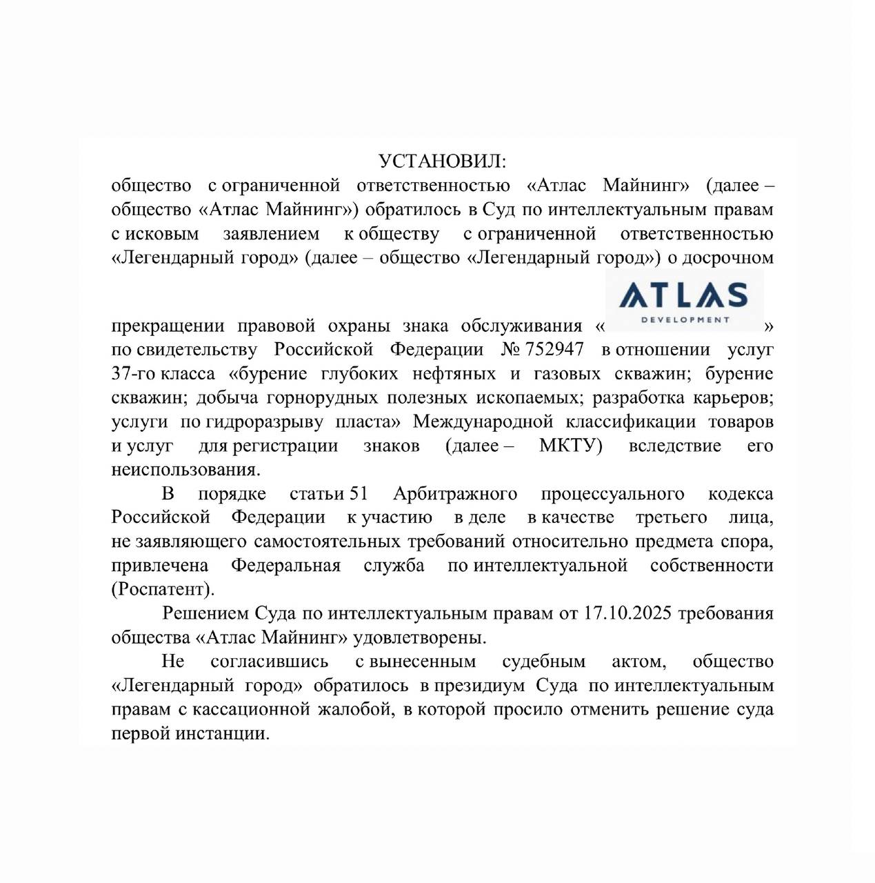 Π‘ΡΠ΄ ΠΏΠΎ ΠΈΠ½ΡΠ΅Π»Π»Π΅ΠΊΡΡΠ°Π»ΡΠ½ΡΠΌ ΠΏΡΠ°Π²Π°ΠΌ Π² ΠΊΠ°ΡΡΠ°ΡΠΈΠΈ ΠΎΡΠΊΠ»ΠΎΠ½ΠΈΠ» ΠΆΠ°Π»ΠΎΠ±Ρ ΠΊΠΎΠΌΠΏΠ°Π½ΠΈΠΈ ΠΡΠ»Π°Ρ ΠΠ΅Π²Π΅Π»ΠΎΠΏΠΌΠ΅Π½Ρ Π½Π° Π»ΠΈΡΠ΅Π½ΠΈΠ΅ ΡΡΠ΄ΠΎΠΌ ΠΏΡΠ°Π² ΠΈΡΠΏΠΎΠ»ΡΠ·ΠΎΠ²Π°Π½ΠΈΡ ΡΠΎΠ²Π°ΡΠ½ΠΎΠ³ΠΎ Π·Π½Π°ΠΊΠ° Π² Π² ΠΎΡΠ½ΠΎΡΠ΅Π½ΠΈΠΈ ΡΡΠ»ΡΠ³ 37-Π³ΠΎ ΠΊΠ»Π°ΡΡΠ° «Π±ΡΡΠ΅Π½ΠΈΠ΅ Π³Π»ΡΠ±ΠΎΠΊΠΈΡ Π½Π΅ΡΡΡΠ½ΡΡ ΠΈ Π³Π°Π·ΠΎΠ²ΡΡ ΡΠΊΠ²Π°ΠΆΠΈΠ½; Π±ΡΡΠ΅Π½ΠΈΠ΅ ΡΠΊΠ²Π°ΠΆΠΈΠ½; Π΄ΠΎΠ±ΡΡΠ° Π³ΠΎΡΠ½ΠΎΡΡΠ΄Π½ΡΡ ΠΏΠΎΠ»Π΅Π·Π½ΡΡ ΠΈΡΠΊΠΎΠΏΠ°Π΅ΠΌΡΡ ; ΡΠ°Π·ΡΠ°Π±ΠΎΡΠΊΠ° ΠΊΠ°ΡΡΠ΅ΡΠΎΠ²; ΡΡΠ»ΡΠ³ΠΈ ΠΏΠΎ Π³ΠΈΠ΄ΡΠΎΡΠ°Π·ΡΡΠ²Ρ ΠΏΠ»Π°ΡΡΠ°».