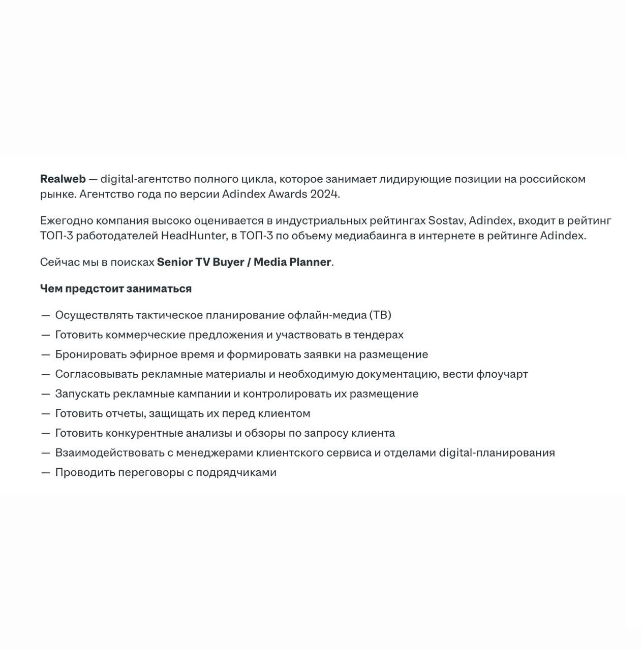 🤓Неожиданная вакансия от Realweb. Судя по ней, одно из крупнейших цифровых агентств выходит в классическое ТВ, они ищут специалиста для его закупки и планирования.