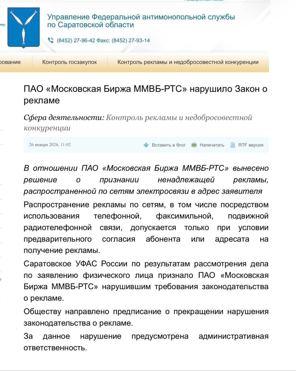 🤔Саратовский ФАС уличил Мосбиржу в спаме. Судя по витиеватой формулировке речь идет о рассылках или звонках в адрес потенциальных клиентов.