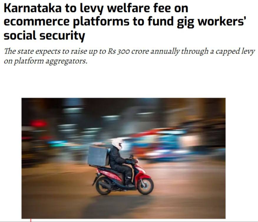 В индийском штате Карнатака власти вводят специальный социальный сбор с e-commerce и цифровых платформ для финансирования соцзащиты курьеров, водителей и доставщиков, работающих через приложения без постоянного контракта.