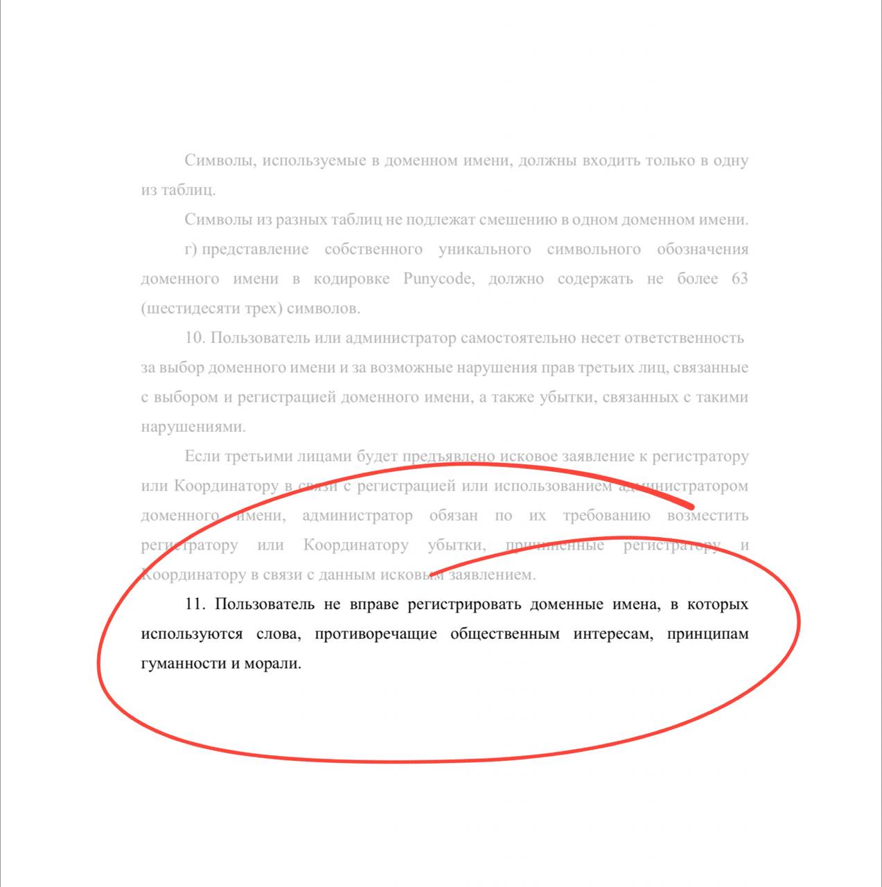 Пункт 11 Правил гласит: «Пользователь не вправе регистрировать доменные имена, в которых используются слова, противоречащие общественным интересам, принципам гуманности и морали».