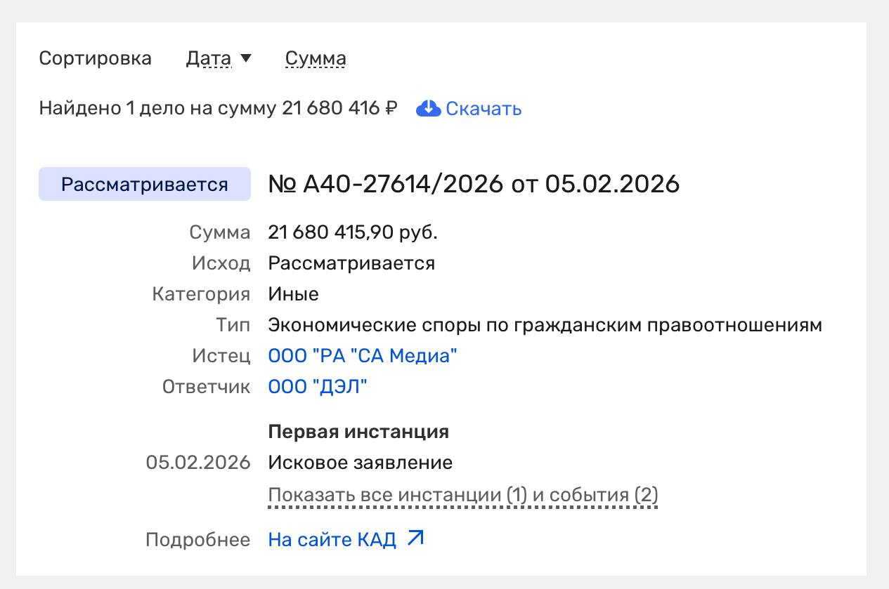 🤔SA Media подало в суд на некрупное рекламное агентство DEL. Сумма претензии 21,6 миллионов.