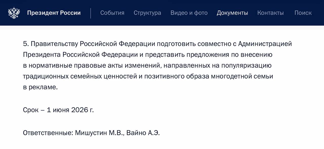 π€ΠΡΠ΅Π·ΠΈΠ΄Π΅Π½Ρ ΠΈΠ·Π΄Π°Π» ΡΠΊΠ°Π· ΠΎ Π²Π½Π΅ΡΠ΅Π½ΠΈΠΈ Π² Π½ΠΎΡΠΌΠ°ΡΠΈΠ²Π½ΡΠ΅ ΠΏΡΠ°Π²ΠΎΠ²ΡΠ΅ Π°ΠΊΡΡ ΠΈΠ·ΠΌΠ΅Π½Π΅Π½ΠΈΠΉ, Π½Π°ΠΏΡΠ°Π²Π»Π΅Π½Π½ΡΡ Π½Π° ΠΏΠΎΠΏΡΠ»ΡΡΠΈΠ·Π°ΡΠΈΡ ΡΡΠ°Π΄ΠΈΡΠΈΠΎΠ½Π½ΡΡ ΡΠ΅ΠΌΠ΅ΠΉΠ½ΡΡ ΡΠ΅Π½Π½ΠΎΡΡΠ΅ΠΉ ΠΈ ΠΏΠΎΠ·ΠΈΡΠΈΠ²Π½ΠΎΠ³ΠΎ ΠΎΠ±ΡΠ°Π·Π° ΠΌΠ½ΠΎΠ³ΠΎΠ΄Π΅ΡΠ½ΠΎΠΉ ΡΠ΅ΠΌΡΠΈ Π² ΡΠ΅ΠΊΠ»Π°ΠΌΠ΅.