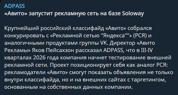🤓Адпасс сходил на мероприятие Авто и сообщает, что Авито купил Soloway и AdRiver для того чтобы сделать свою РСЯ. Тестирование продукта начнется к концу года. Доклад окончен.