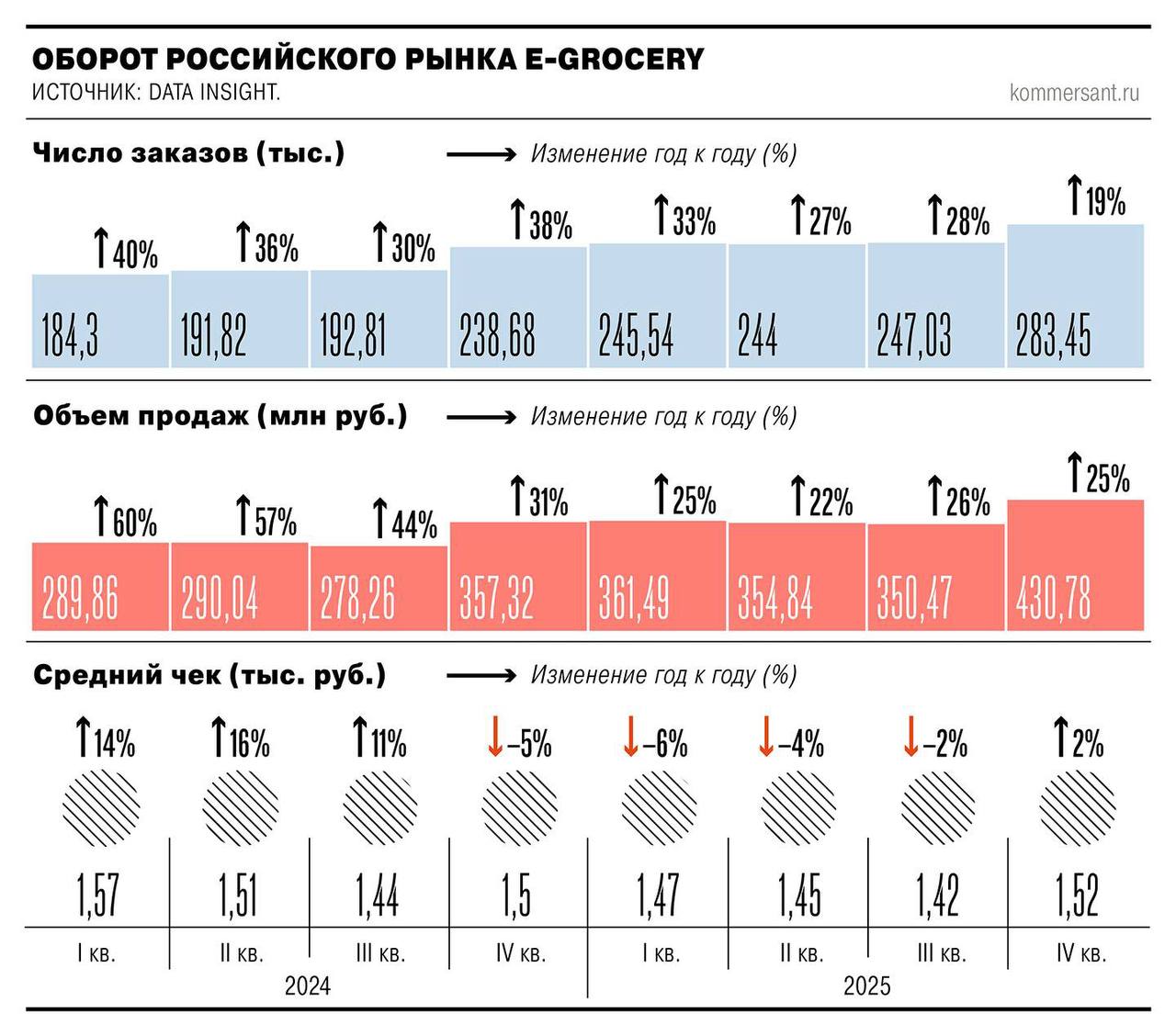 🤓Как мы видим, за два года динамика роста продаж FMCG в онлайне упала более чем в два раза. При этом, относительное падение динамики в деньгах выше, чем в штуках. А средний чек стабилизировался и даже слегка упал.