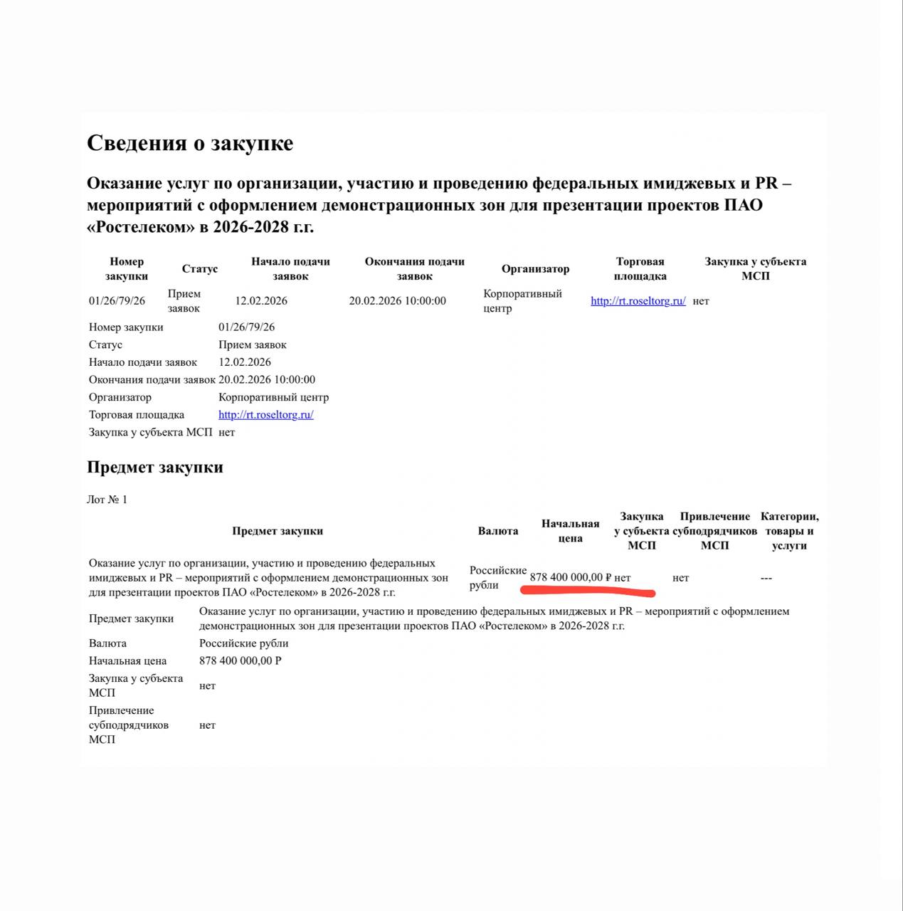 🤓Тендер Ростелекома на PR и оформление пространств. Изначальная сумма — почти миллиард рублей. Период — до 2028 года. А вы говорите, в PR-е денег нету и все обороты в медийке…
