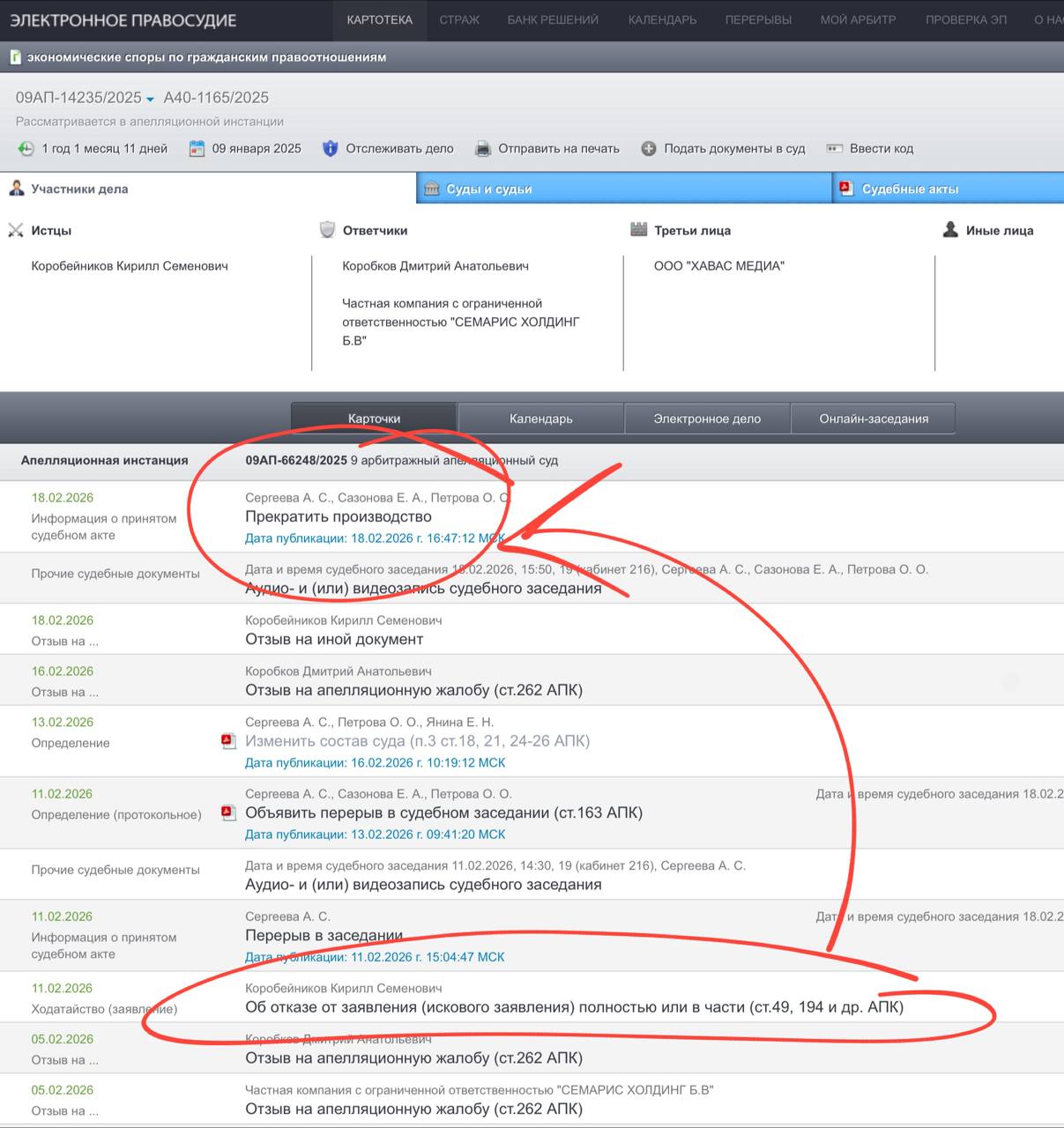 🤓На сайте Девятого арбитражного апелляционного суда появилось извещение о том, что производство по по апелляционной жалобе Коробейникова К.С. на решение Арбитражного суда города Москвы от 05.11.2025 прекращено по заявлению истца об отказе от иска.