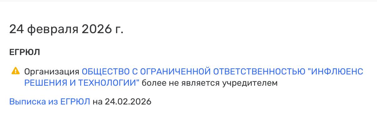 🤔Из ООО «Перфлюенс» вышел учредитель, юрлицо ООО «Инфлюенс решения и технологии». Компания ликвидирована в январе этого года. До этого права владения были забавно закольцованы.