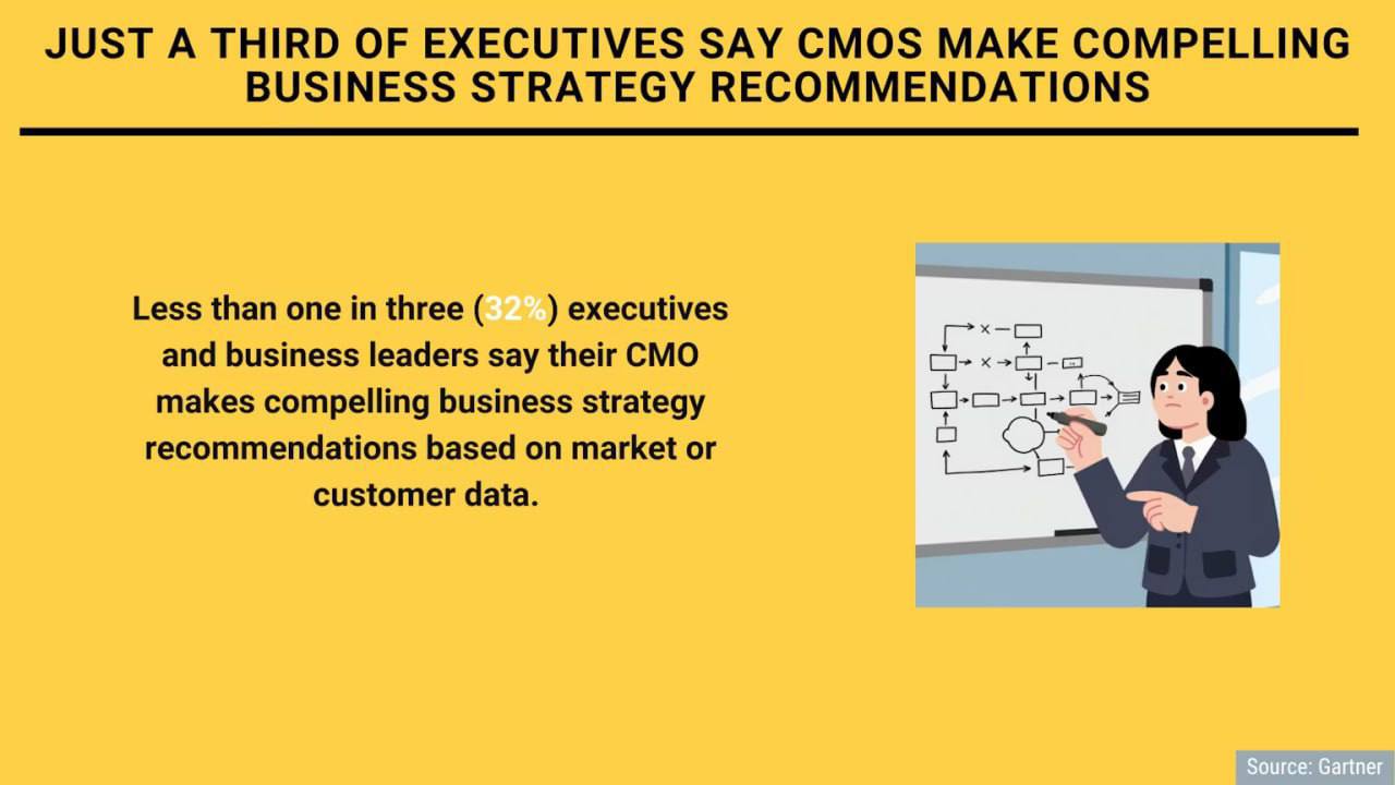 — По данным исследования Gartner, в мире лишь 32% руководителей считают, что директора по маркетингу (CMO) предлагают убедительные бизнес-стратегии на основе данных о клиентах и рынке.