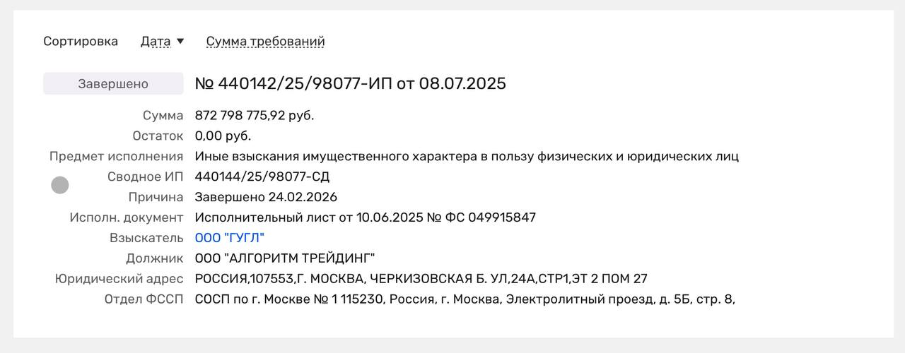 🤓24 февраля завершилось исполнительно производство по взысканию более чем миллиарда рублей с ООО «Алгоритм трейдинг». Относительно того чье это юрлицо рынок затаился в молчании, хотя все все понимают.