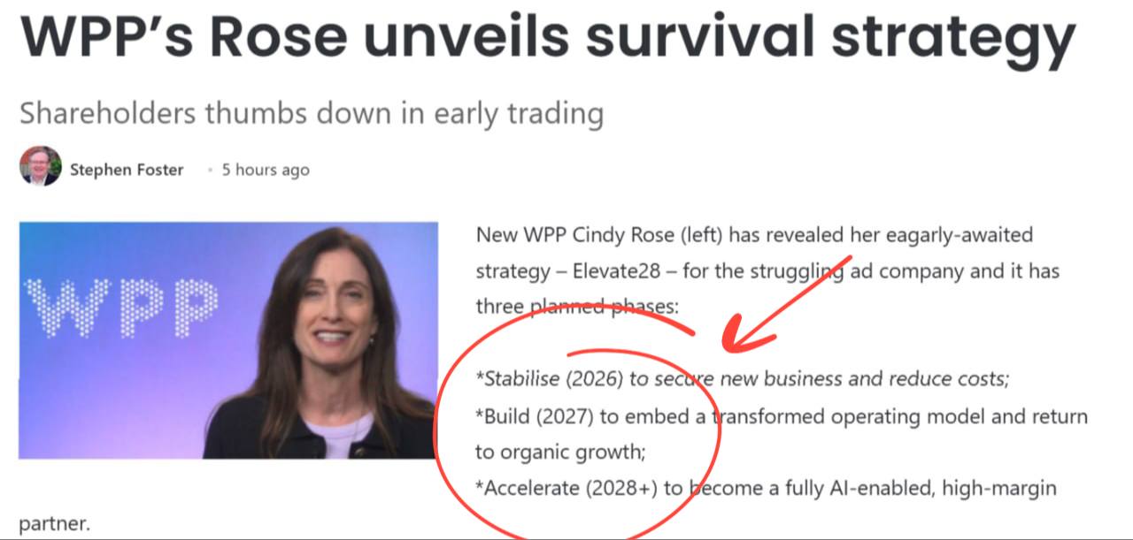 🤔Глава WPP Синди Роуз представила порцию завтраков для акционеров стратегию спасения для глобальной рекламной группы на 2026–2028+ годы под названием Elevate28. Стратегия подразумевает: стабилизацию бизнеса, возврат к росту и переход к «полностью AI-ориентированной модели».