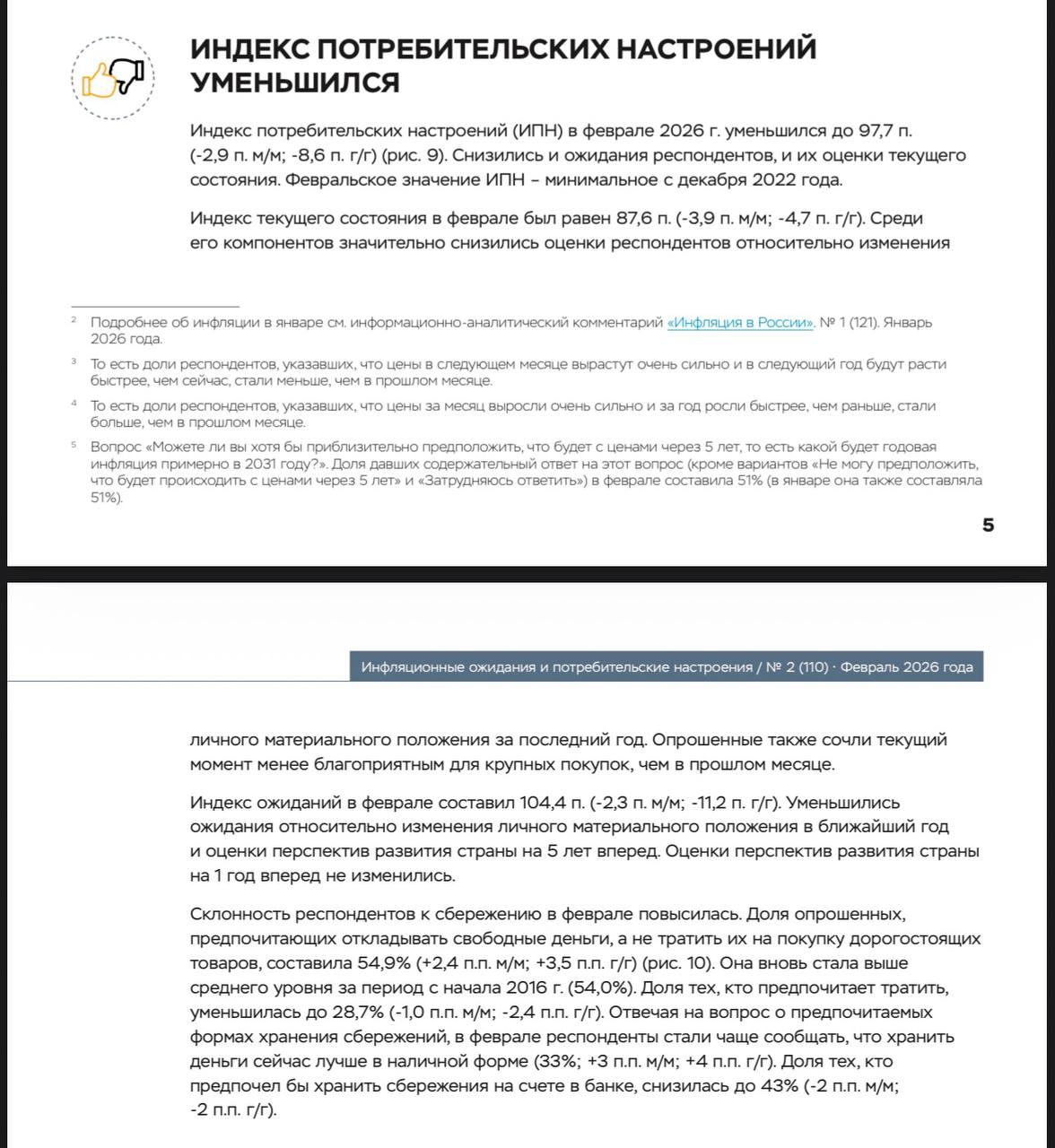 🤓А вот — данные ЦБ. Февральское значение Индекса Потребительских Настроений – минимальное с декабря 2022 года. Если коротко, покупательская активность впадает в депрессию. Прогнозировать с оглядкой на бум потребления 23-24 годов — не имеет смысла.